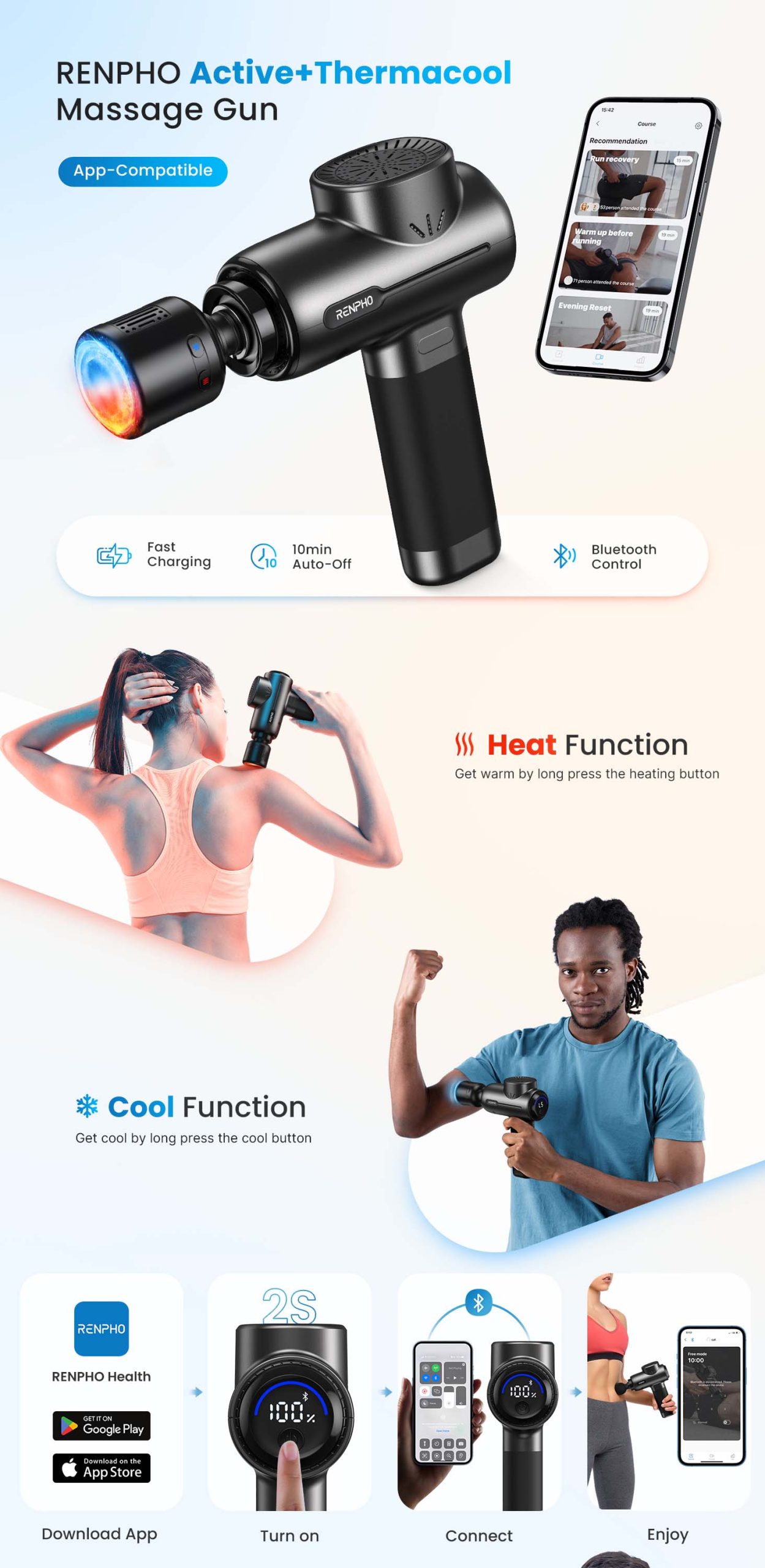 Renpho Massager gun deep tissue with Heat comes with a heating and cooling massage head(No built-in battery) that can heat up to 117 Β°F (47 Β°C) or cool down to 50 Β°F(10 Β°C) for deeper muscle relaxation and stress relief
